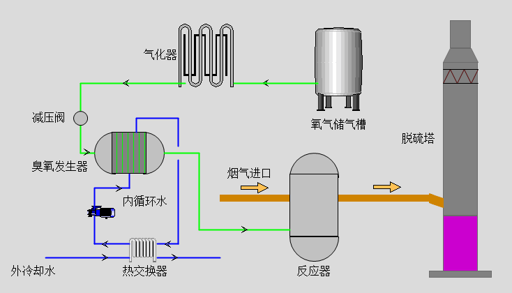 氧化反应主要是利用臭氧的强氧化性,将不可溶的低价态氮氧化物氧化为可溶的高价态氮氧化物,然后在洗涤塔内将氮氧化物吸收,达到脱除的目的。同时不影响其它污染物控制技术,是传统脱硝技术的一个高效补充或替代技术。