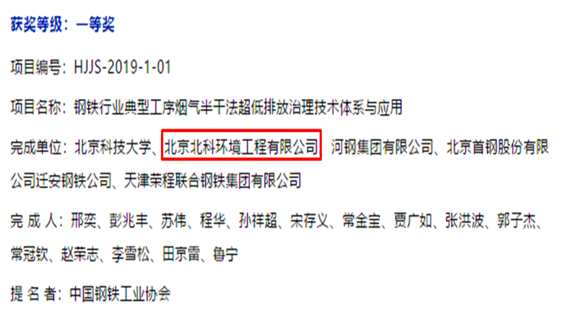 为充分发挥科技奖励对环保产业技术进步的促进作用,建立以企业为主体、市场为导向、产学研用相结合的环保产业技术创新体系,鼓励我国环境技术原始创新、集成创新,促进环保产业高质量发展,支撑生态环境治理,加快改善环境质量,2019年12月20日,中国环境保护产业协会根据《环境技术进步奖奖励办法(试行)》的规定,经过专家辅导、单位提名,评审委员会评审、现场答辩、奖励委员会审定和公示,由华球体育、北京科技大学、河钢集团、北京首钢股份有限公司、北京首钢国际工程技术有限公司、天津荣程联合钢铁集团有限公司联合完成的科技成果“半干法烟气超低排放与多功能耦合关键技术及其在钢铁行业的应用”项目,荣获 “钢铁行业典型工序烟气半干法超低排放治理技术体系与应用” 2019年度环境技术进步奖一等奖。