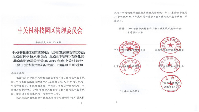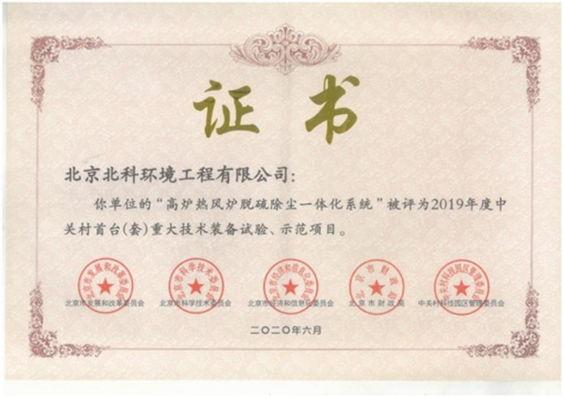 2020年6月,北科环境喜迎捷报,由公司自主研发的“高炉热风炉脱硫除尘一体化系统”,被评为2019年度中关村首台(套)重大技术装备试验、示范项目。