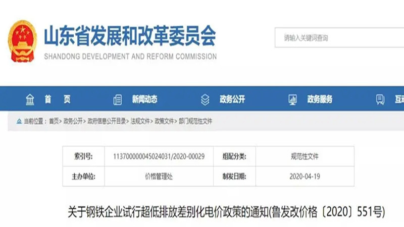 山东省:近日,山东省发布《钢铁企业试行超低排放差别化电价政策的通知》,自2020年7月1日起施行,有效期至2022年6月30日。